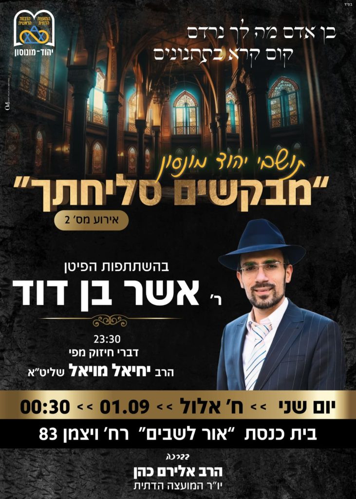 ביום שני, ח' באלול, יתקיים בבית הכנסת "אור לשבים" ברחוב ויצמן 83 מעמד סליחות מרומם במסגרת היוזמה "מבקשים סליחתך" של המועצה הדתית יהוד-מונוסון.