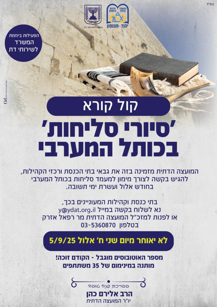 המועצה הדתית יהוד-מונוסון מקדמת את יוזמת המשרד לשירותי דת ומזמינה גבאי בתי כנסת וראשי קהילות להצטרף למיזם המיוחד של סיורי סליחות בכותל המערבי. במסגרת ...