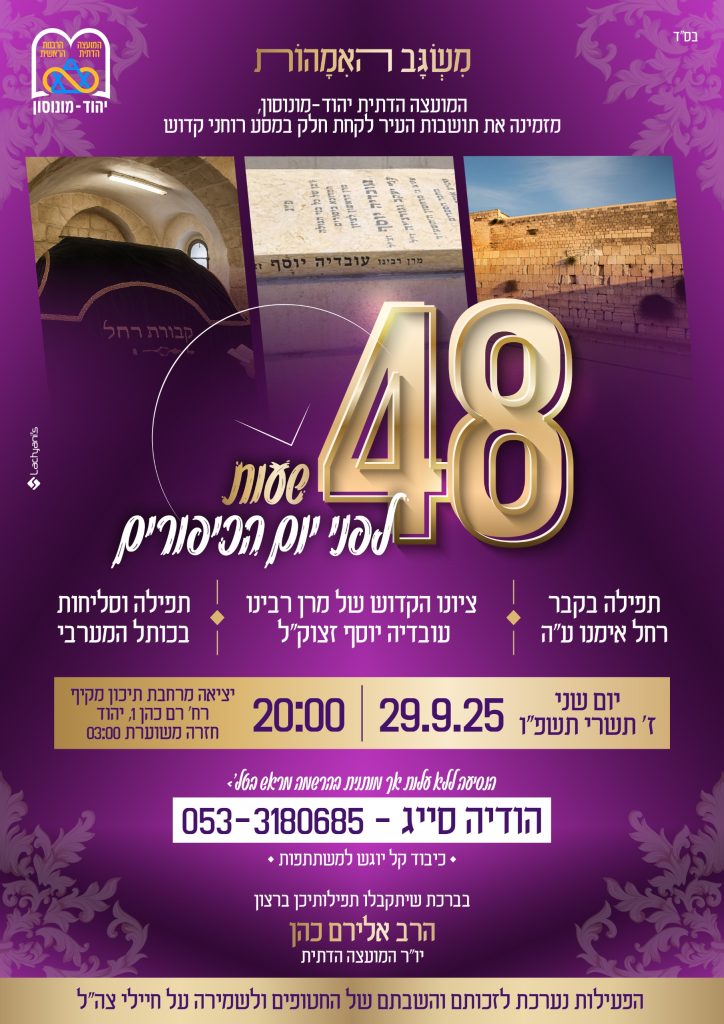 24 שעות לפני יום הכיפורים, ביום שלישי, ח' תשרי תשפ"ו (30.9.25), המועצה הדתית יהוד-מונוסון מזמינה את הציבור לנסיעה משפחתית מרוממת לכותל המערבי.במהלך הע...