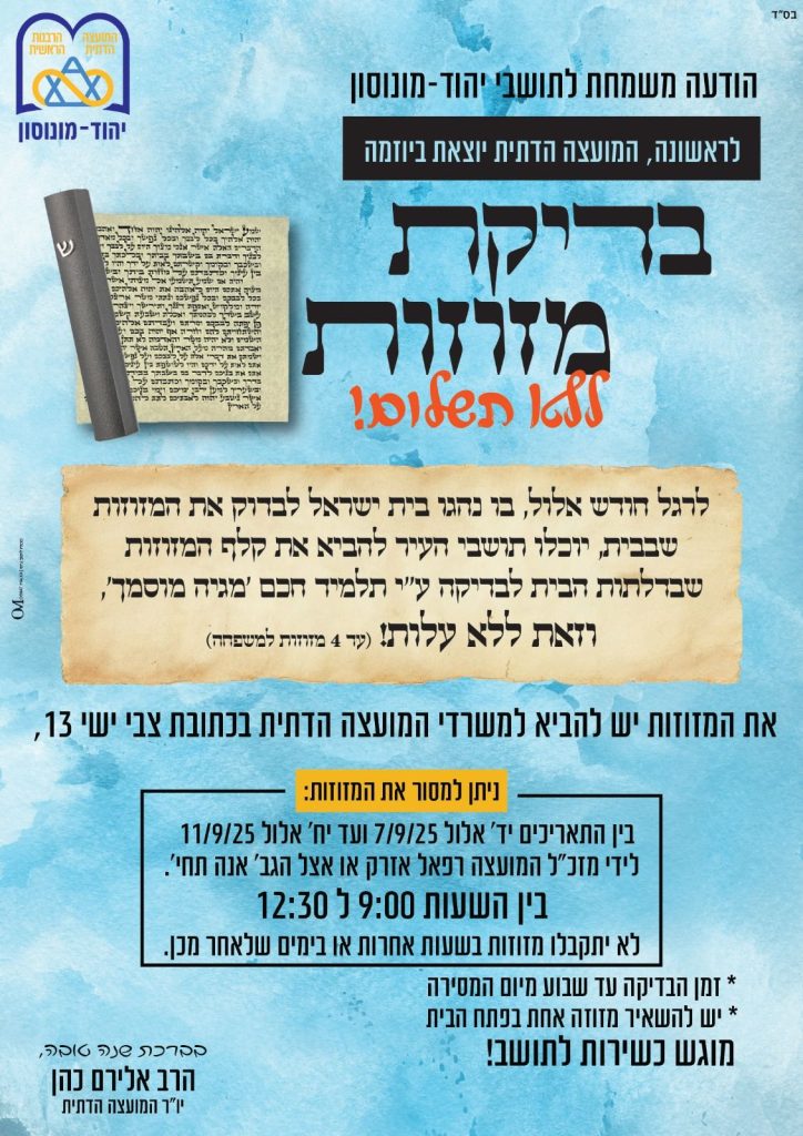 לראשונה ביהוד-מונוסון: המועצה הדתית ביוזמת יו"ר המועצה, הרב אלירם כהן, מעניקה לתושבי העיר אפשרות ייחודית לבדוק את המזוזות בביתם – ללא עלות.