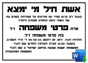 - לאחר קבלת הודעת פטירה מהרופא נא להתקשר לחברה קדישא לטלפון: