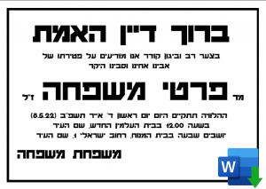 - תעודת פטירה זמנית מבית חולים (תעודת פטירה קבוע מקבלים ממשרד הפנים לאחר חודש(