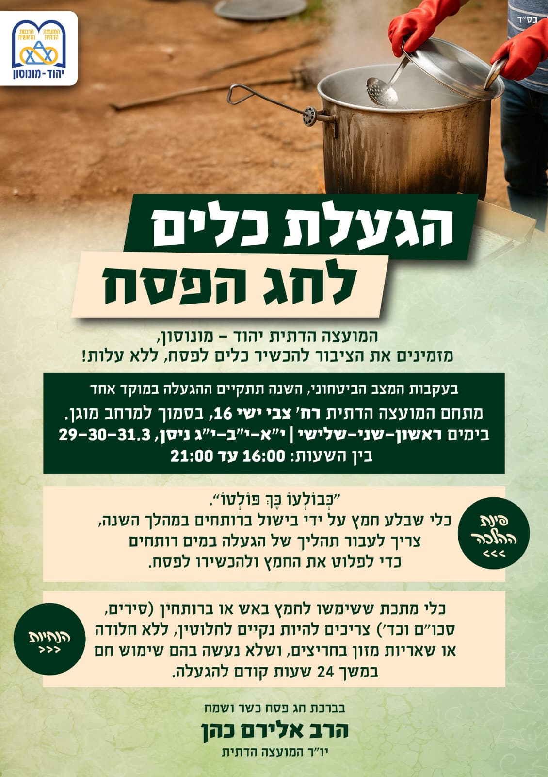 לקראת חג הפסח, המועצה הדתית יהוד-מונוסון מזמינה את תושבי העיר להכשיר כלים לפסח ללא עלות,