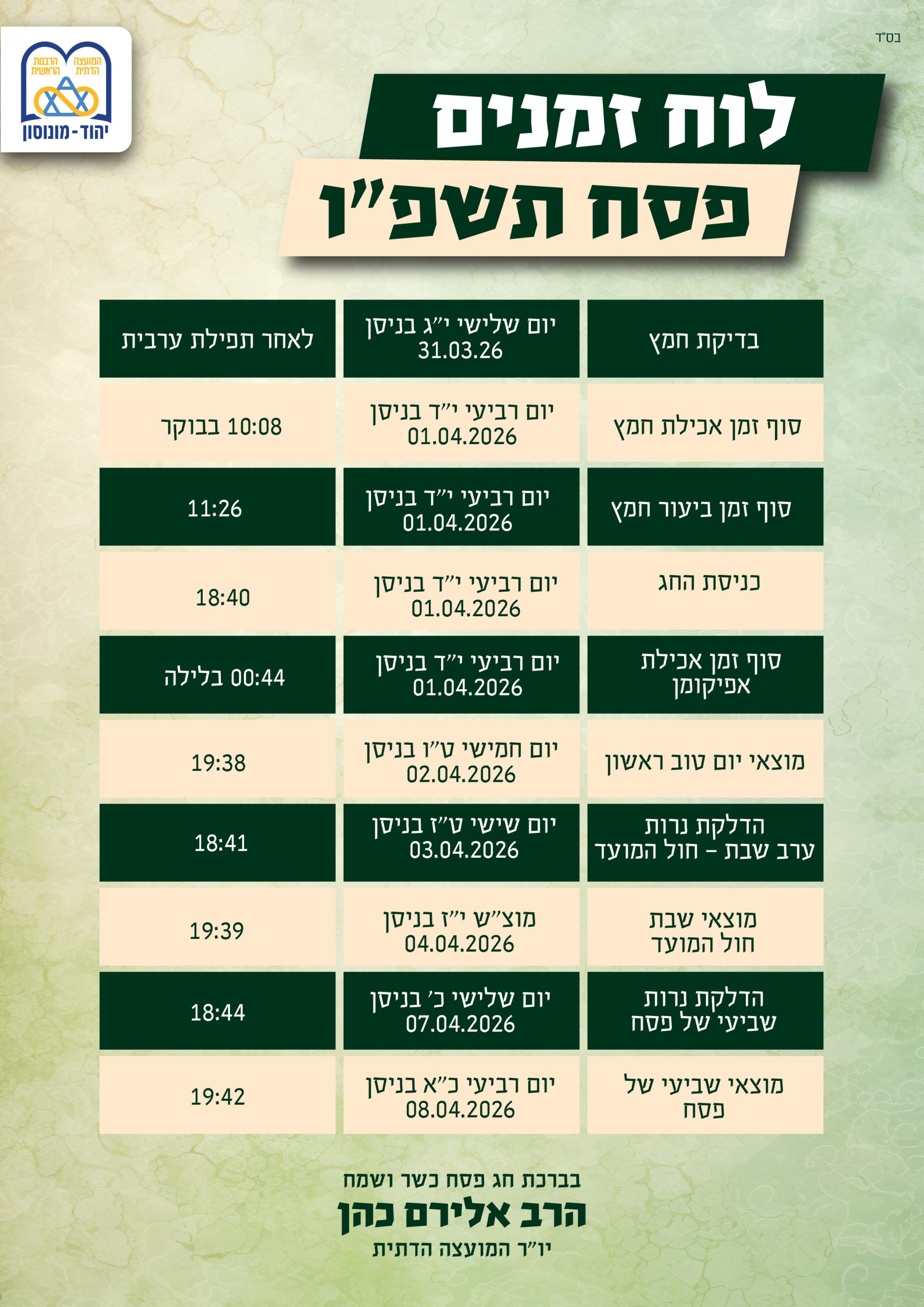 המועצה הדתית יהוד-מונוסון מפרסמת לציבור את לוח הזמנים המלא לחג הפסח תשפ"ו, ובו זמני בדיקת חמץ, סוף זמן אכילה וביעור, כניסת החג, זמני הדלקת נרות ומועדי חול המועד ושביעי של פסח.