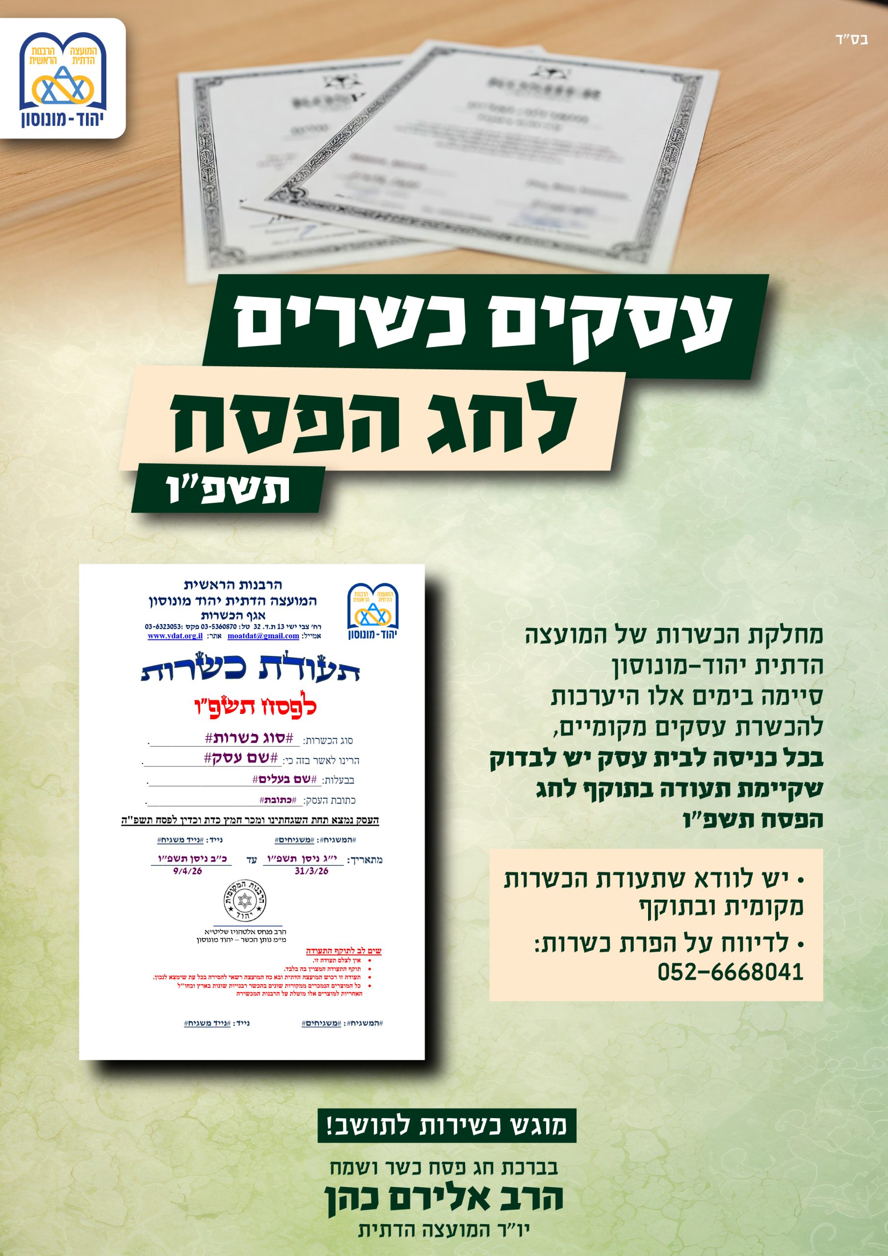 מחלקת הכשרות של המועצה הדתית יהוד-מונוסון סיימה בימים אלו את ההיערכות להענקת כשרות לפסח תשפ"ו לעסקים מקומיים בעיר.