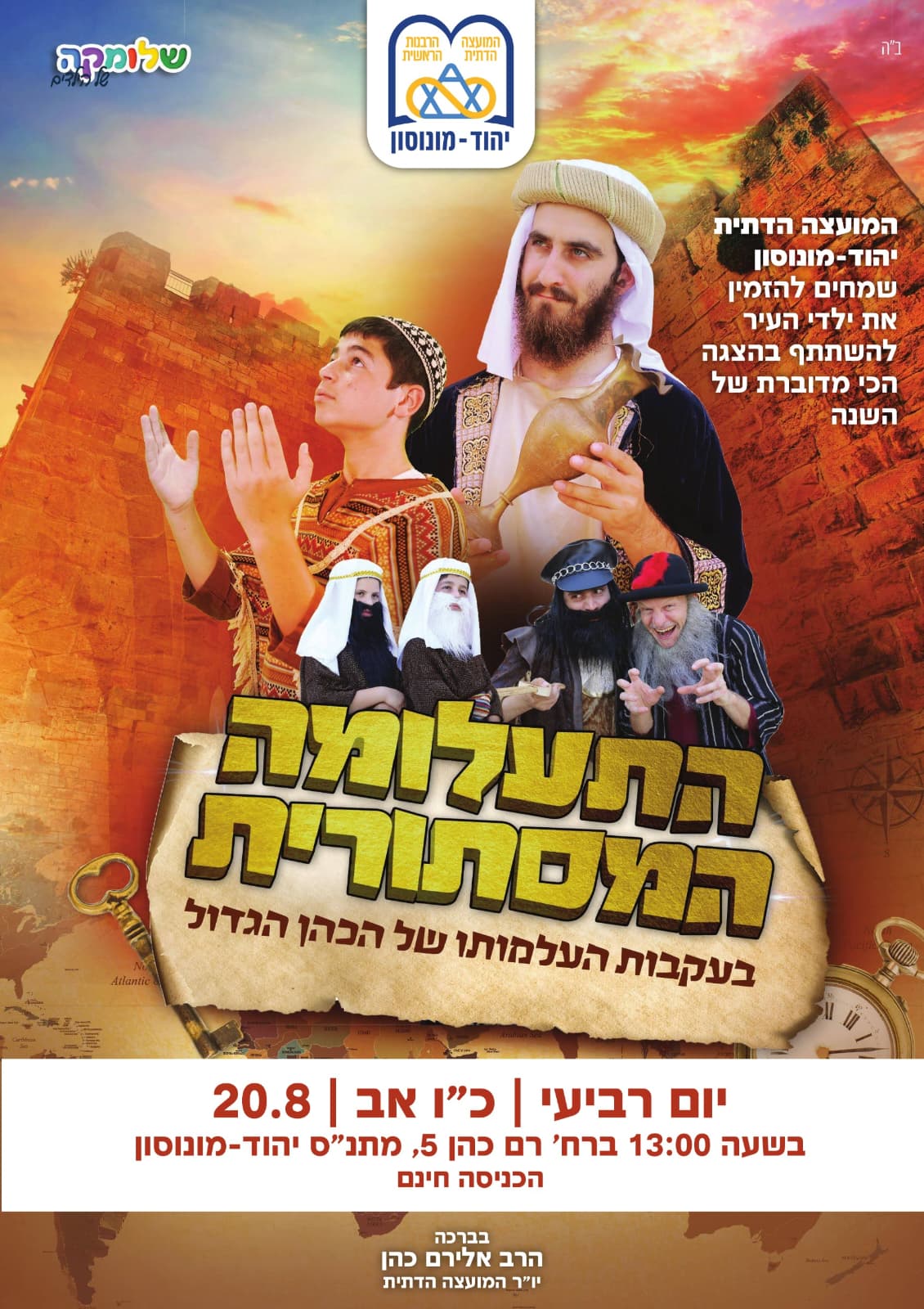 ההצגה תתקיים אי"ה ביום רביעי, כ"ו אב (20.8), במתנ"ס יהוד שברחוב רם כהן 5. הכניסה חופשית, והאירוע ייערך בהפרדה מלאה.
