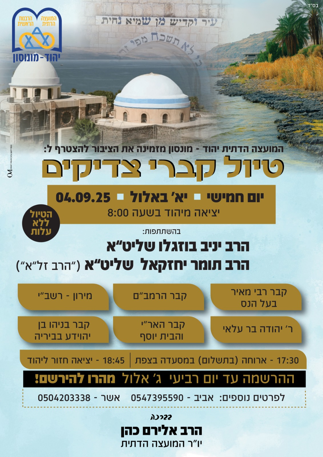 חוויה רוחנית ומרוממת עבור תושבי העיר. הטיול ייערך ללא עלות, אך מותנה ברישום מוקדם עד יום חמישי, י"א אלול (4.9.25).