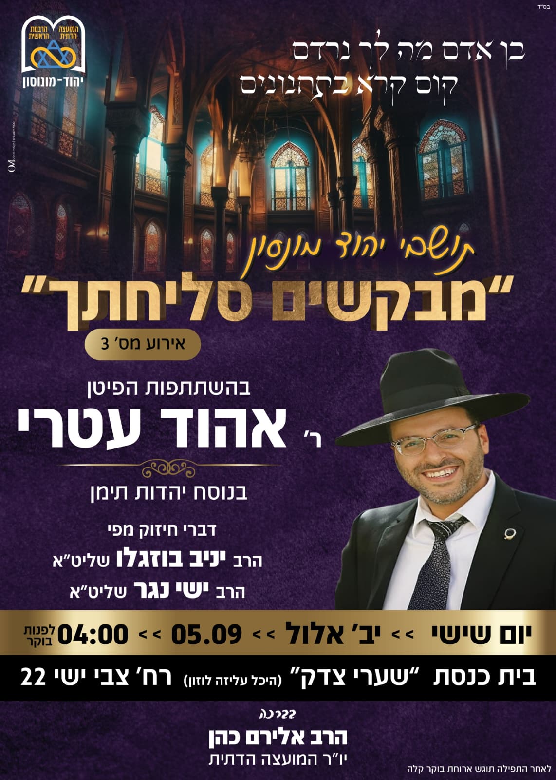 ביוזמת יו"ר המועצה הדתית יהוד-מונוסון, הרב אלירם כהן, יתקיים מחר (שישי) בשעה 04:00 לפנות בוקר המעמד השלישי במסגרת סדרת הסליחות "מבקשים סליחתך".