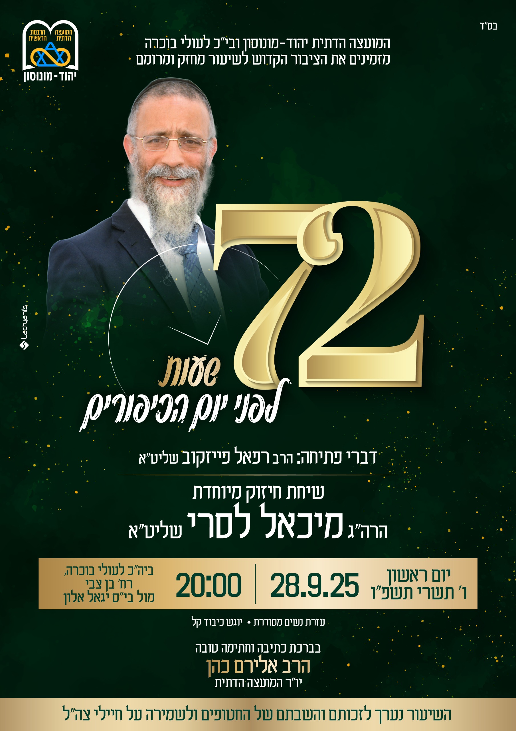 במסגרת ימי ההתקדשות לקראת יום הכיפורים, המועצה הדתית יהוד-מונוסון מזמינה את הציבור לשיעור חיזוק מרומם עם הרב מיכאל לסרי שליט"א. דברי פתיחה יישא הרב רפאל פייזקוב שליט"א.