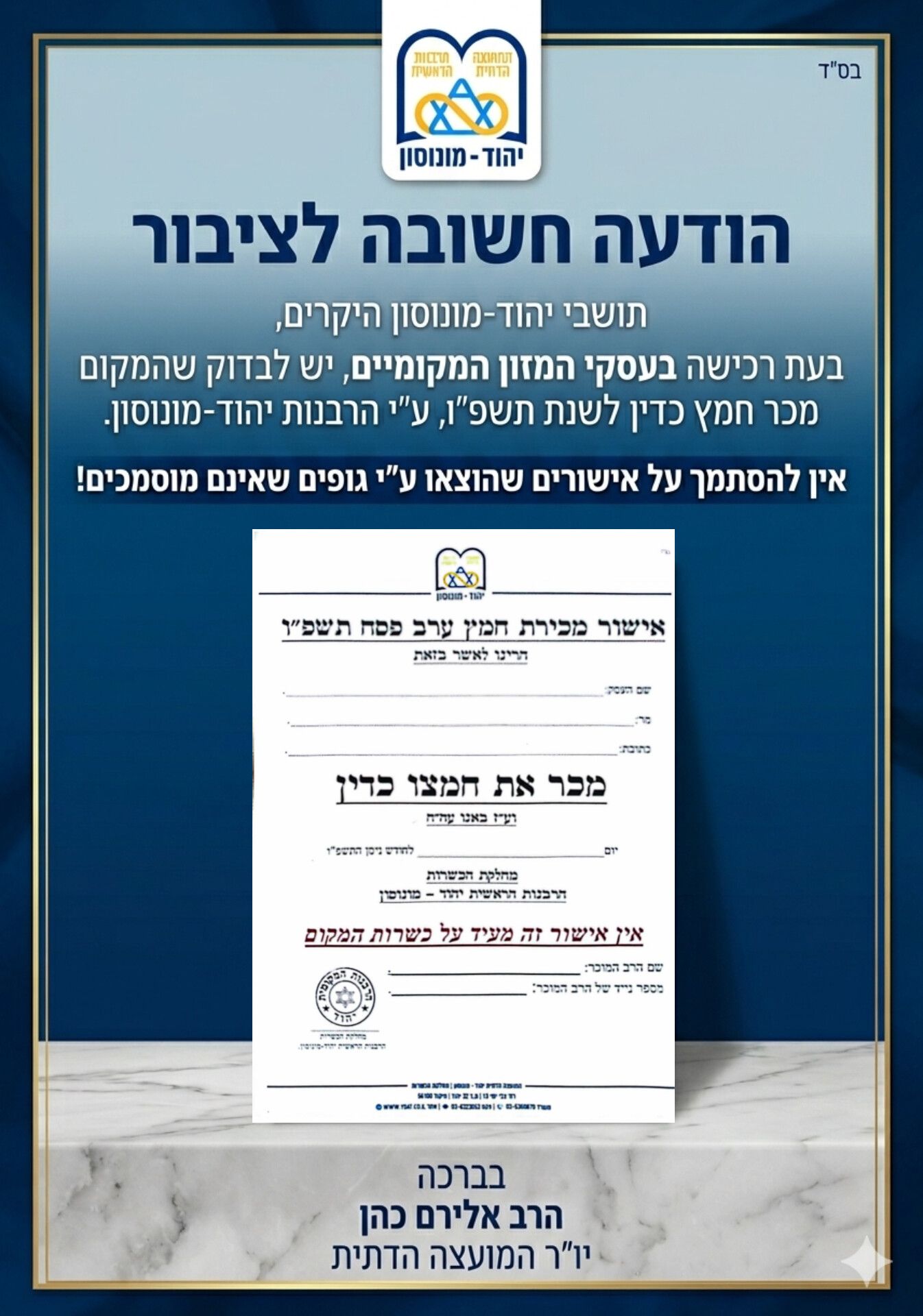 על כן, יש לוודא כי בעסק מוצג אישור רשמי של מכירת חמץ לשנת תשפ"ו, שנערך על ידי הרבנות המוסמכת, ורק כך ניתן לרכוש במקום בביטחון ובשקט נפשי.